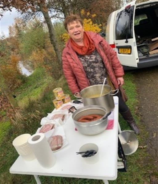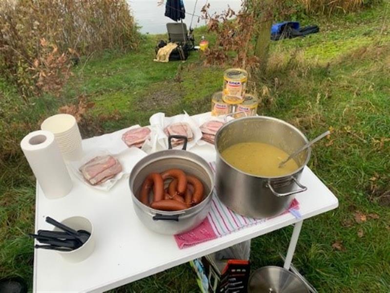 Na de loting waarbij de 9 vissers een eigen plek mochten kiezen zijn we om 8:30 uur va start gegaan.Er werd door een aantal vissers in de eerste uren een visje gevangen maar de vangsten waren niet goed.Na 2 uurtjes te hebben gevist kwam Marga Kookt de overheerlijke erwtensoep brengen en de befaamde rookworst van de HEMA zodat de vissers een heerlijk warme kop erwtensoep en een warme rookworst kon nuttigen. En natuurlijk roggebrood met spek kon niet ontbreken bij dit culinair hoogstandje.